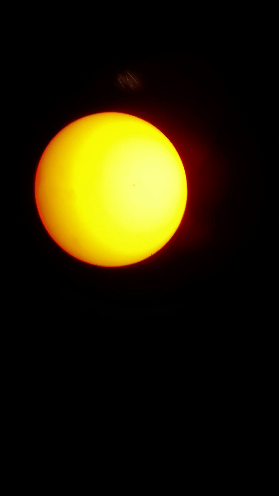 Beginn des Merkurtransits (siehe nächstes Bild 5Uhr). Merkur ist rechts unten vor der Sonne zu sehen. Diese Bilder wurden mit einem Handy am Teleskop abfotografiert.