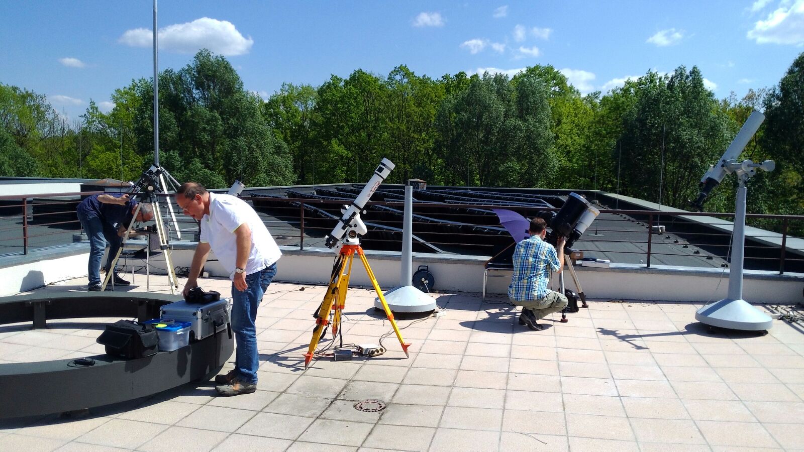 Moderiert wurde die Veranstaltung von Cem Avsar von der TU Berlin, Institut für Luft- und Raumfahrt. Dann wurde es spannend. Um 10:47 Uhr blickten die Teilnehmer und weitere Gäste mit Spezialbrillen zum wolkenfreien Himmel. Die Sonne war in diesem Moment zu fast Dreivierteln vom Mond bedeckt. Es wurde spürbar dunkler und kühler. Die Sternenfreunde im FEZ stellten für die Schüler verschiedene Teleskope zur Beobachtung auf.Auch der spaceclub_berlin war dabei.