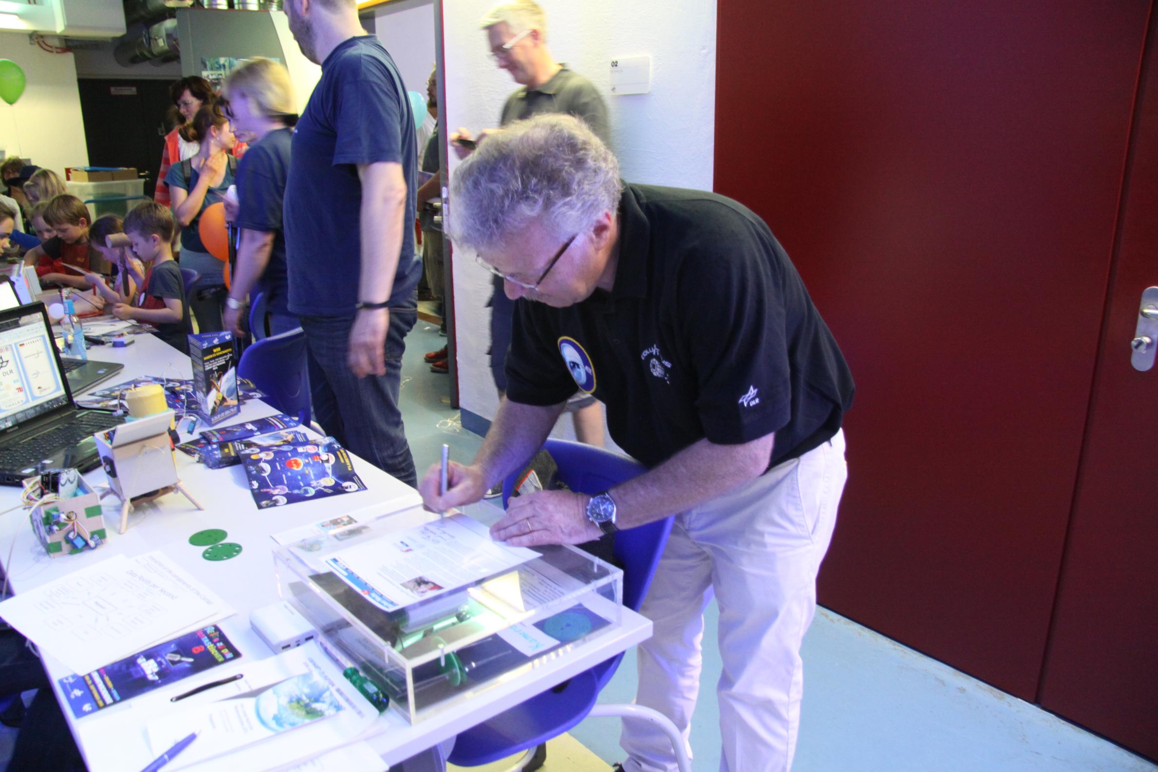 Der absolute Höhepunkt für unsere Jugendlichen war der exklusive Besuch des deutschen Astronauten Dr. Reinhold Ewald, der sich ausführlich über das CanSat – Projekt des spaceclub_berlin informierte und den Teilnehmern viel Erfolg bei der Europameisterschaft (24. - 28.6.2015) in Portugal wünschte.